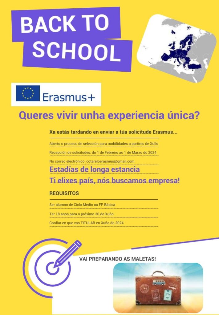 Aberto o proceso de selección para mobilidades a partires de xullo. Correo: cotareloerasmus@gmail.com